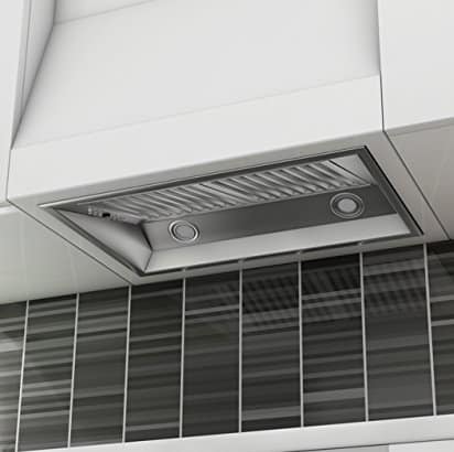 Insert range hoods, also known as ‘undermount’ range hoods, are inserted or fully integrated into the cabinet above the cooking surface. Aesthetically they look great, as the biggest part of the range hood is not visible. As opposed to retractable range hoods, insert range hoods generally don’t have any retractable parts, or any other parts sticking out for that matter. However, like with retractable range hoods, saving space means there’s a trade-off. The size of the cabinet above the cooking surface is usually smaller than the size of the cooking surface under it. That means that the range hood won’t cover the whole surface of the cooking surface, and therefore only captures a limited part of the odors, oils and fumes.